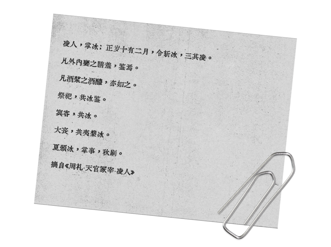 早在西周时期,天子会举行隆重的典礼,按功勋爵位把藏冰赏赐给官员们解暑,以示天恩。据《周礼·天官·凌人》记载,专门负责斩冰储冰的官员叫“凌人”。