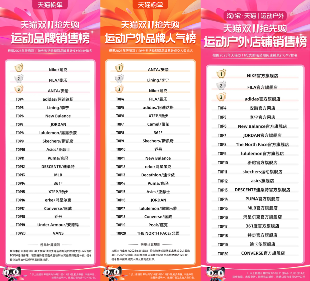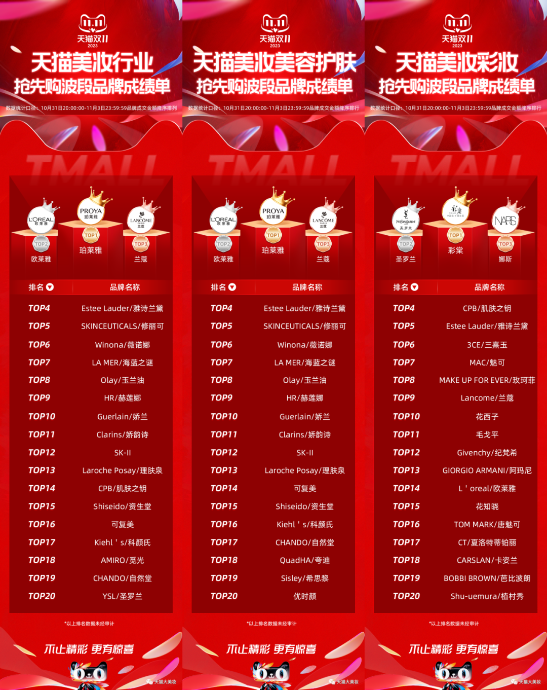 天猫双11于10月31日晚8点正式开售,抢先购期间(10月31日-11月3日)美妆健康等大类目品牌排行榜陆续出炉。(来源:天猫大美妆、运动猩球)