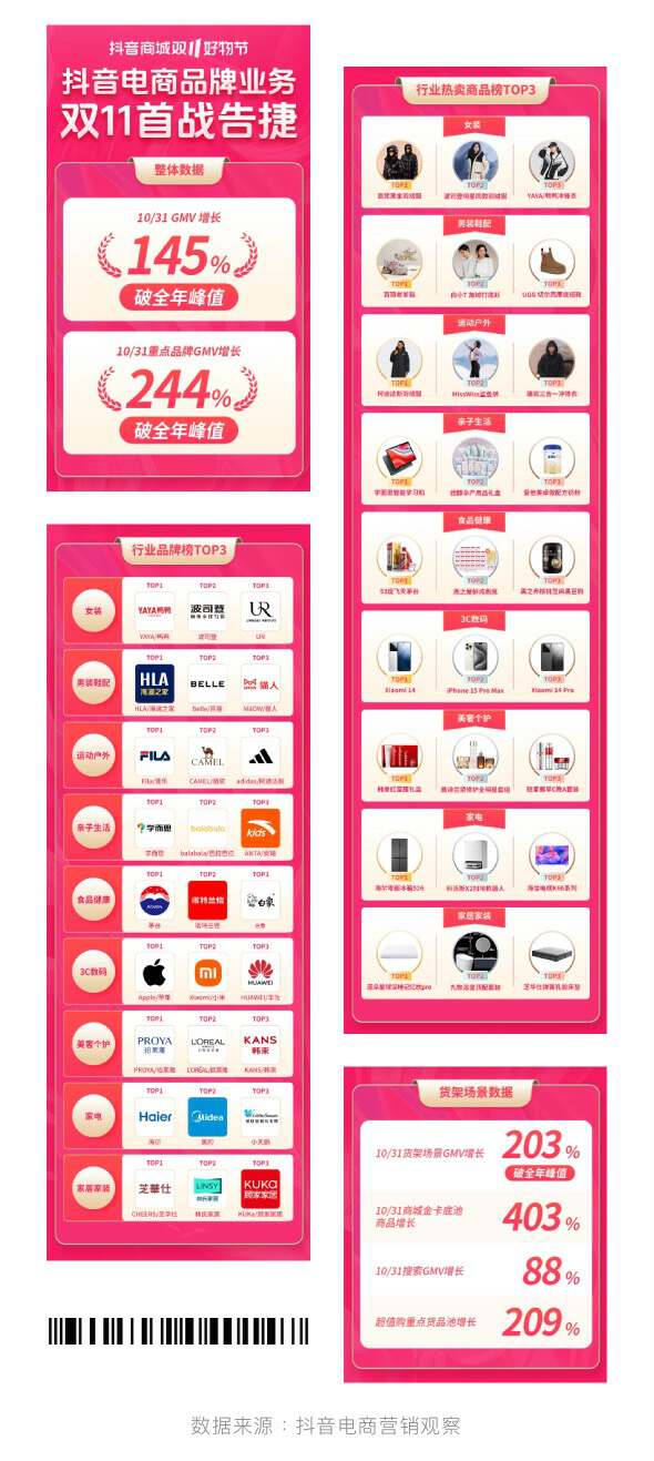 11月5日,抖音电商发布截止至10月31日的全平台多项数据,官方数据显示,10月31日当天,抖音电商多项数据突破全年峰值,品牌商家整体GMV增长145%,重点品牌GMV增长244%;货架场消费潜力得到进一步释放,其中,货架场品牌商家整体GMV增长203%,商城金卡底池品牌商品增长403%实现大爆发,搜索GMV增长88%。(来源:抖音电商营销观察)