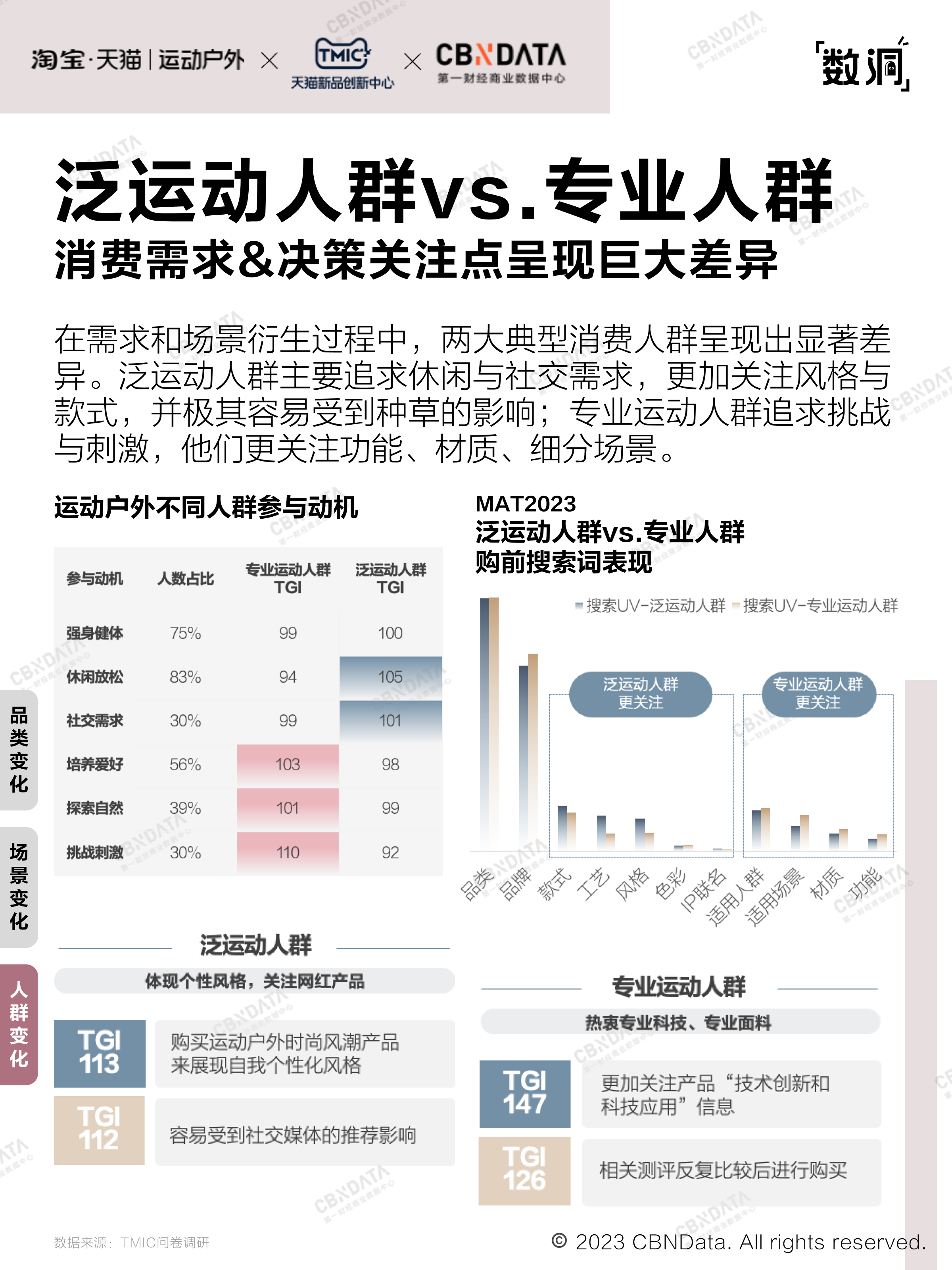 在需求和场景衍生过程中,专业运动人群和泛运动人群两大类消费者额关注点出现了明显差异。