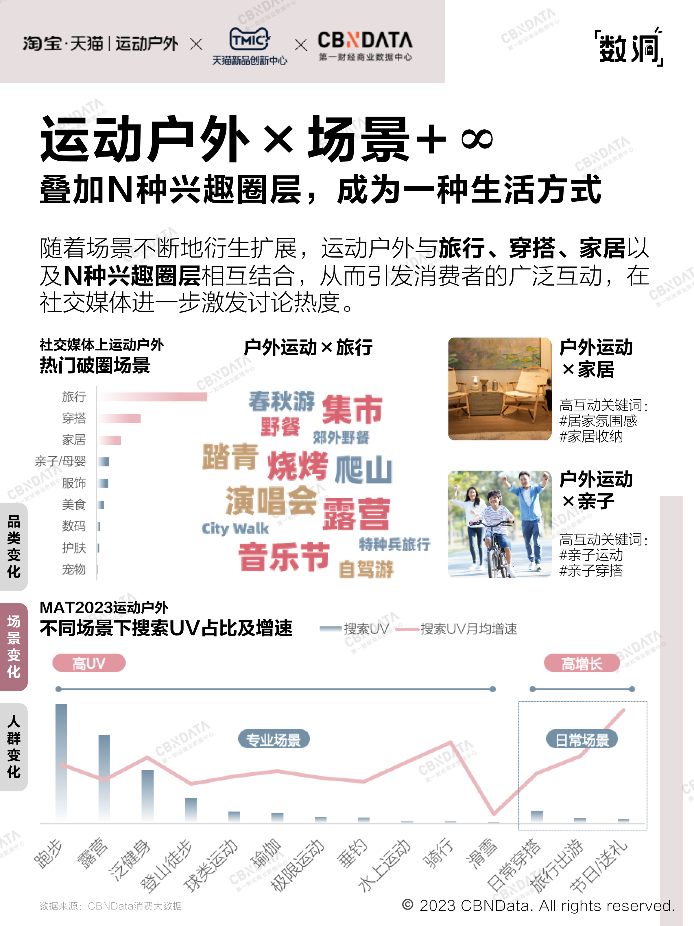 在场景不断衍生扩展中,运动户外与旅行、穿搭、家居等N种兴趣圈层相互吸引和结合,从而引发消费者的积极互动。