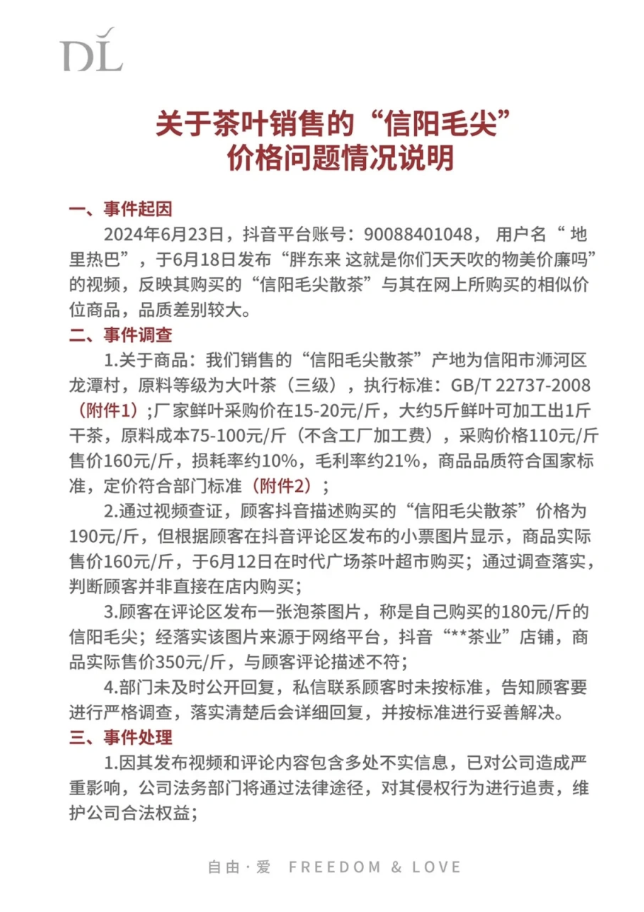 顾客质疑茶叶价格高,胖东来发布21页情况说明:内容不实,追究法律责任。
