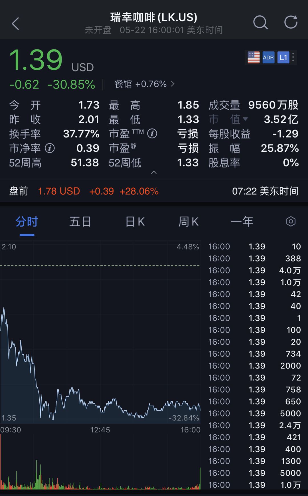 瑞幸咖啡美股盘前涨幅扩大至30%,现报1.8美元。