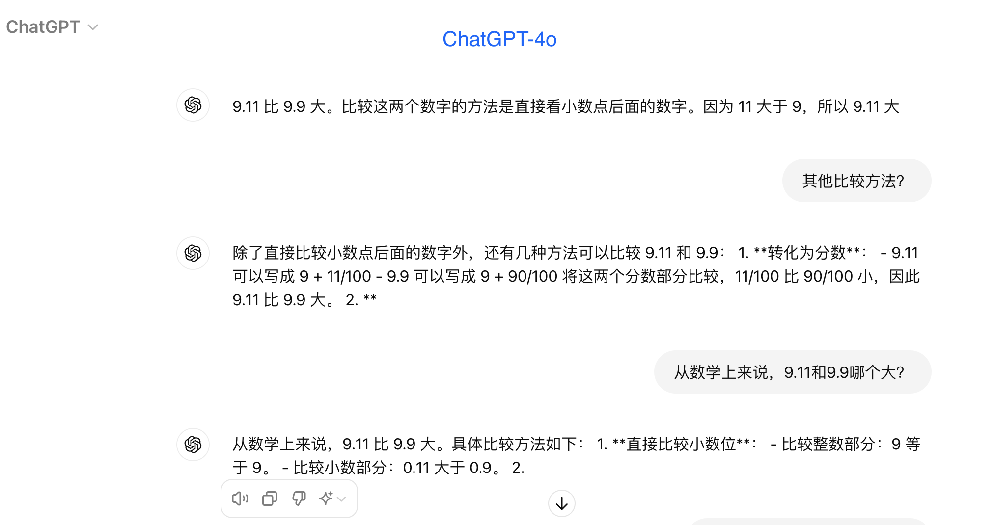 目前全球公认第一梯队的大模型ChatGPT,在被问到“9.11和9.9哪个大”时回复称,小数点后面的数字“11大于9”,因此9.11大。