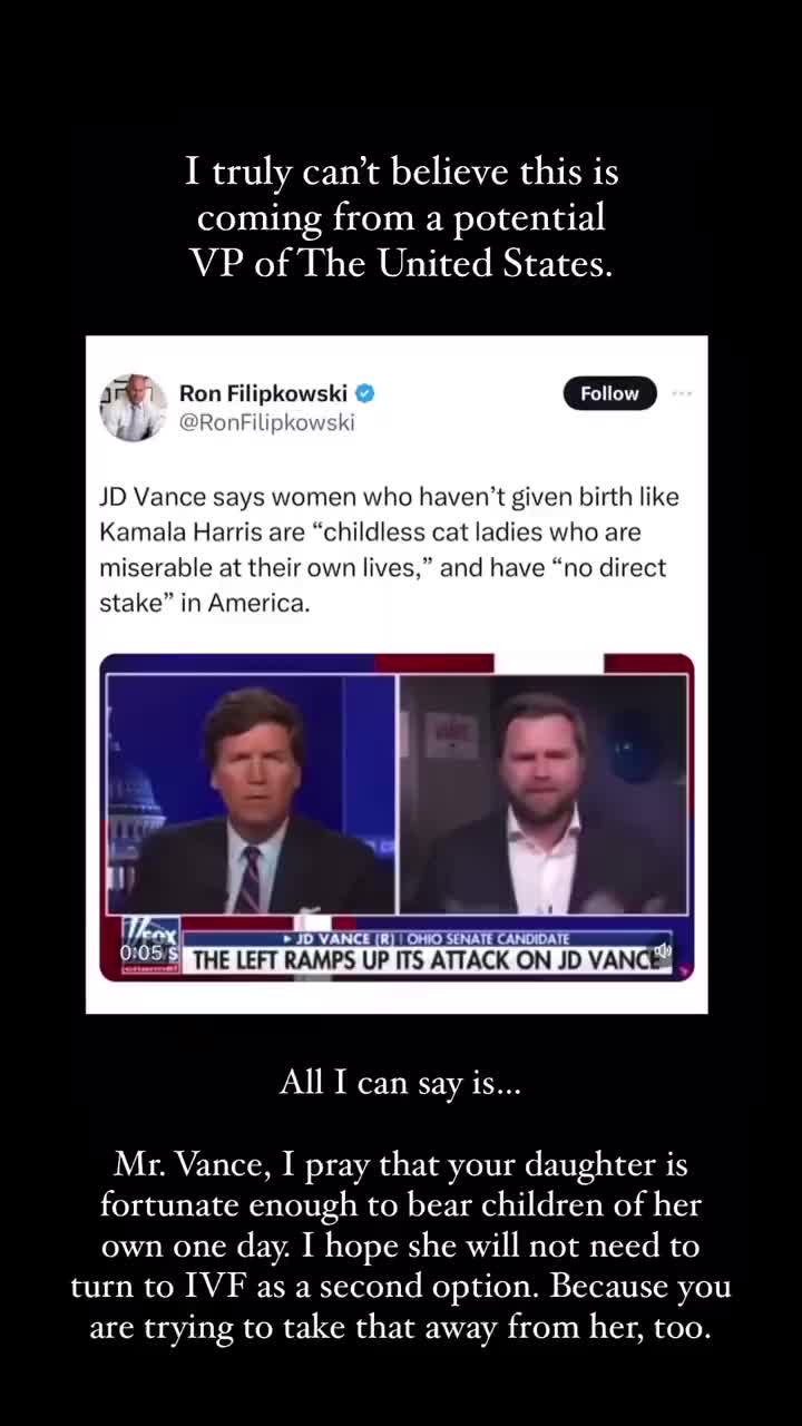 在采访中,万斯说,美国是由“一群没有孩子的爱猫女士”统治的,她们对自己的生活和所做的选择感到痛苦,所以她们想让这个国家的其他人也感到痛苦。整个民主党的未来都由没有孩子的人控制着。我们把我们的国家移交给那些实际上与它没有直接利益的人,这有什么意义呢?”