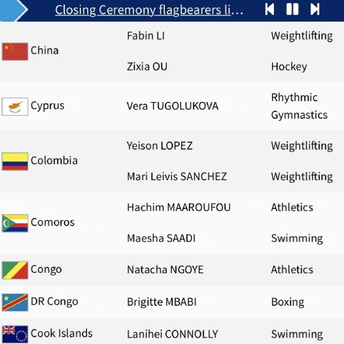 据央视新闻,8月11日,巴黎奥运会官方公布了各代表团闭幕式旗手名单,中国旗手为举重奥运冠军李发彬和中国女子曲棍球队队长欧紫霞。