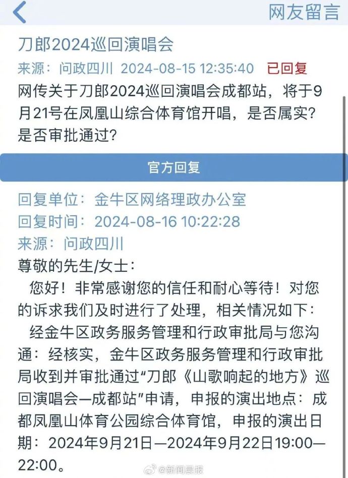 据了解,“刀郎《山歌响起的地方》巡回演唱会”已在成都、广州通过审批或许可。