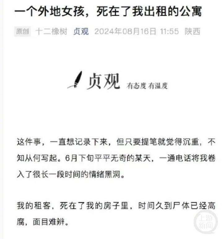 据上游新闻,近日,一篇自媒体文章《一个外地女孩,死在了我出租的公寓》引发广泛关注,随即“33岁女子饿死在出租屋”等话题多次冲上热搜。文章中关于女子死因、毕业高校、在老家“考编”经历等方面的描写,引起网友巨大的讨论和质疑。