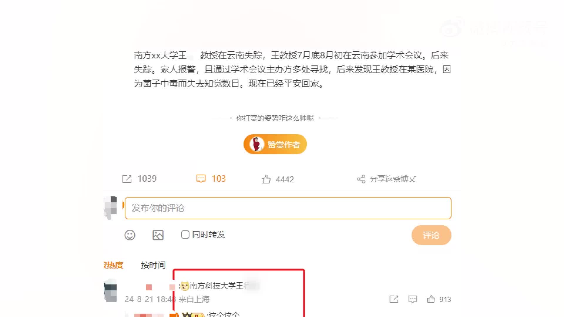 日前,有人爆料称南方科技大学王教授在云南开会时,因菌类中毒住院。该教师7月底8月初云南参加学术会议后失联。家人报警,且通过学术会议主办方多处寻找,后发现该教师在某医院因菌子中毒而失去知觉数日,现已平安到家。