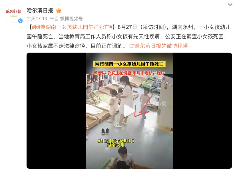 据哈尔滨日报8月27日消息,湖南永州一幼儿园被曝有小女孩午睡死亡,当地教育局工作人员称小女孩有先天性疾病,公安正在调查小女孩死因,小女孩家属不走法律途径,目前正在调解。