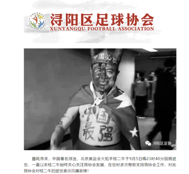 资深球迷桂二牛昨晚去世,当地足协、俱乐部发文悼念。