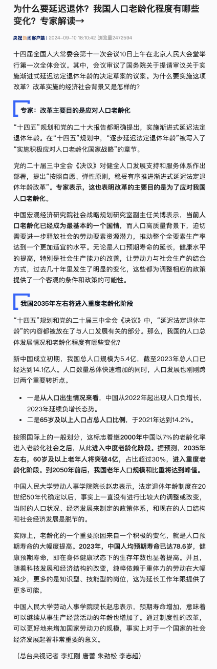据央视新闻,十四届全国人大常委会第十一次会议9月10日上午在北京人民大会堂举行第一次全体会议。其中,会议审议了国务院关于提请审议关于实施渐进式延迟法定退休年龄的决定草案的议案。为什么要实施这项改革?改革实施的经济社会背景又是怎样的?