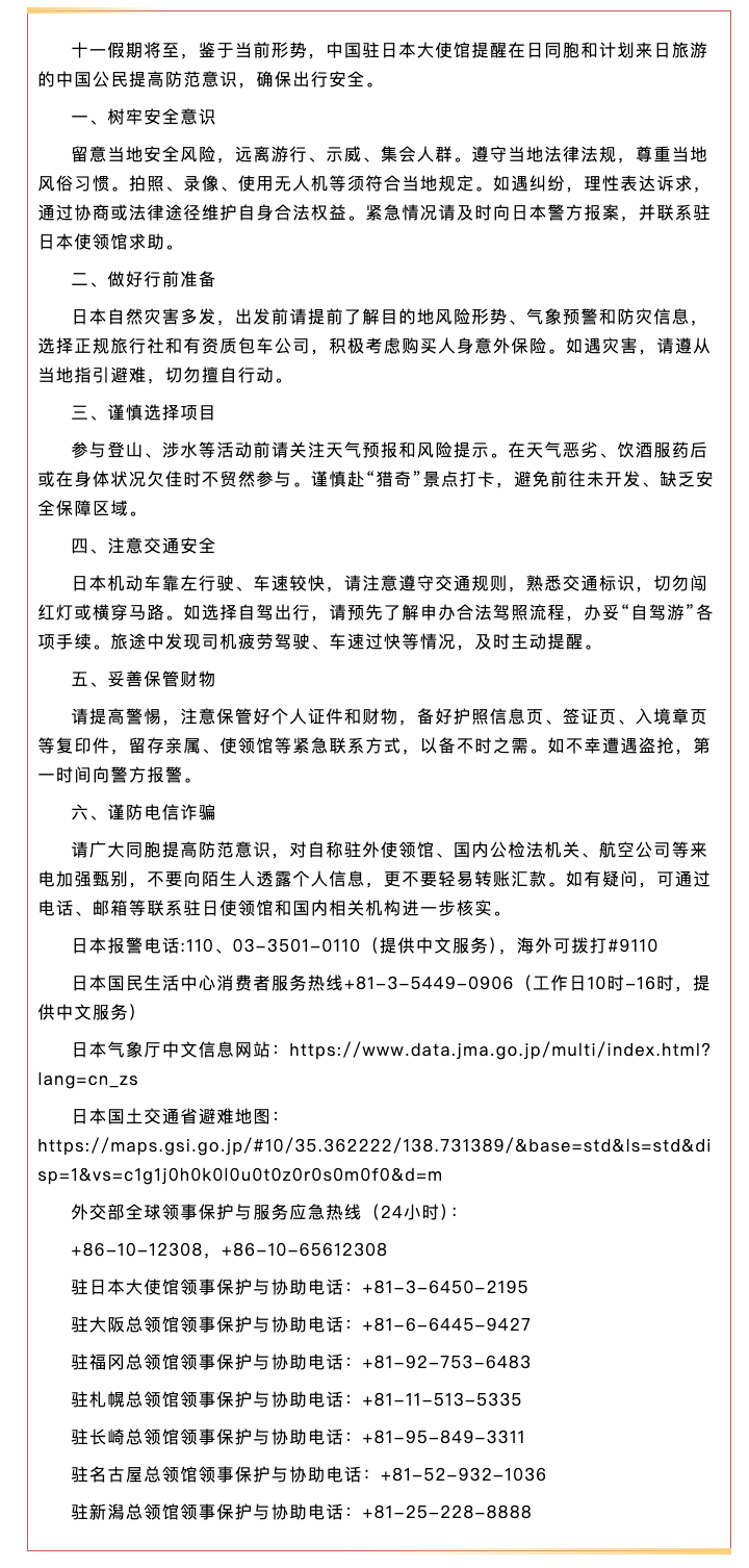 中国驻日本大使馆9月24日提醒中国公民十一期间注意出行安全:十一假期将至,鉴于当前形势,中国驻日本大使馆提醒在日同胞和计划来日旅游的中国公民提高防范意识,确保出行安全。