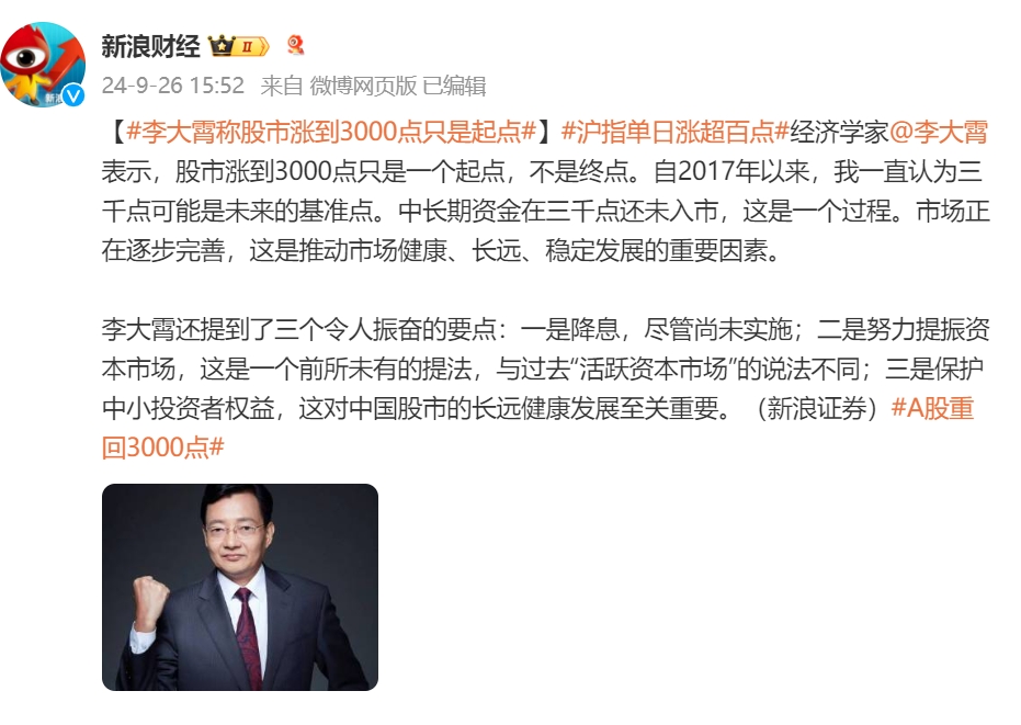 据新浪财经,前券商首席经济学家李大霄表示,股市涨到3000点只是一个起点,不是终点。自2017年以来,我一直认为三千点可能是未来的基准点。中长期资金在三千点还未入市,这是一个过程。市场正在逐步完善,这是推动市场健康、长远、稳定发展的重要因素。李大霄还提到了三个令人振奋的要点:一是降息,尽管尚未实施;二是努力提振资本市场,这是一个前所未有的提法,与过去“活跃资本市场”的说法不同;三是保护中小投资者权益,这对中国股市的长远健康发展至关重要。