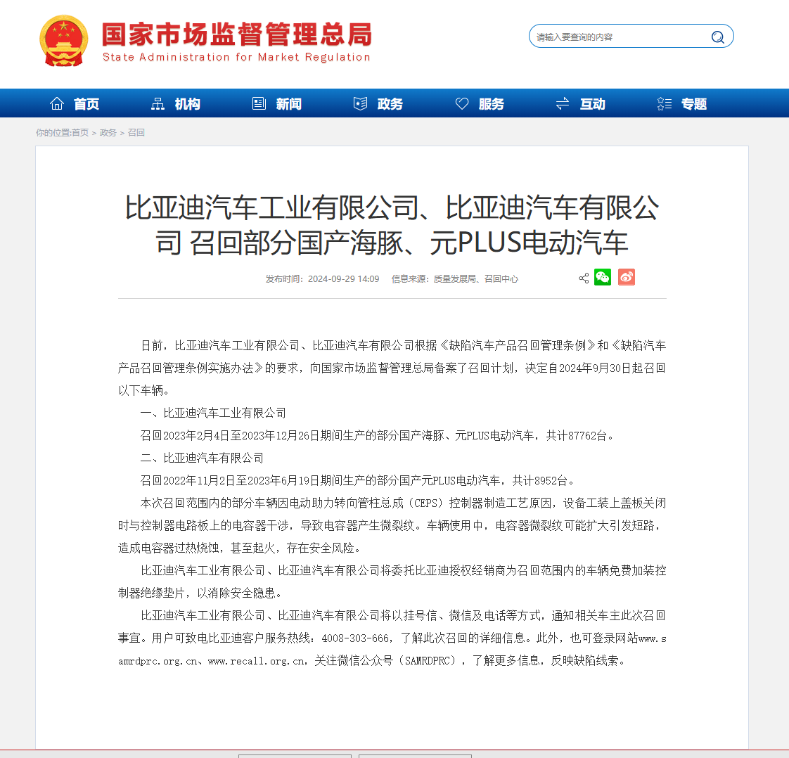 据财联社,国家市场监督管理总局消息,日前,比亚迪汽车工业有限公司、比亚迪汽车有限公司根据《缺陷汽车产品召回管理条例》和《缺陷汽车产品召回管理条例实施办法》的要求,向国家市场监督管理总局备案了召回计划,决定自2024年9月30日起召回以下车辆。