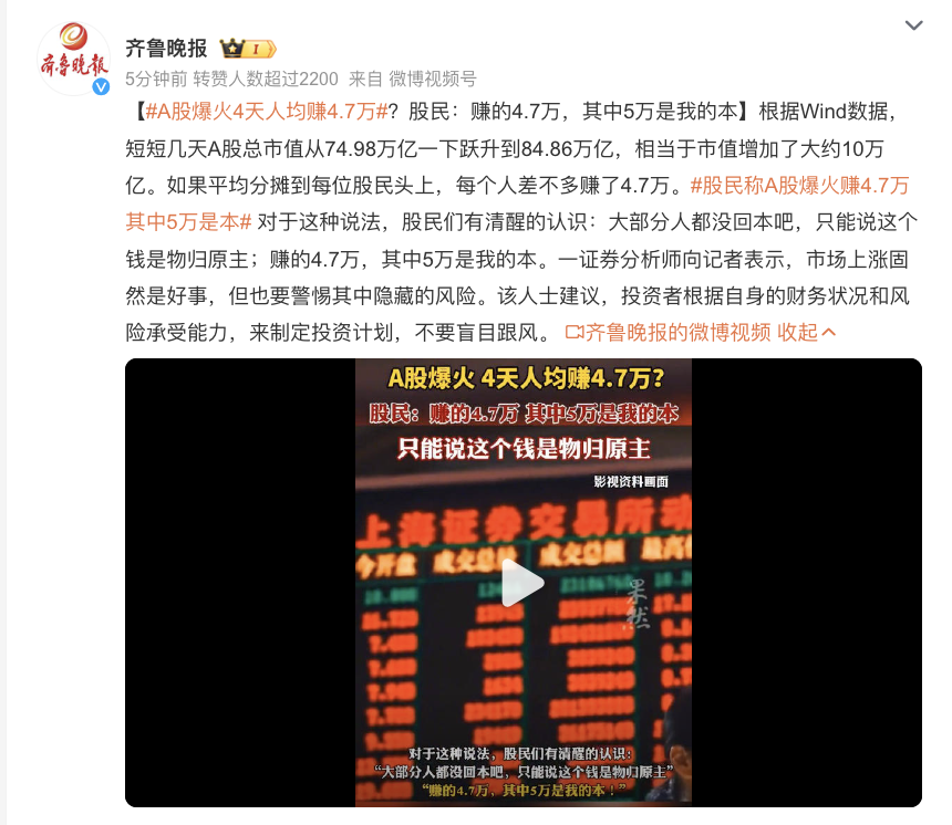 A股爆火4天人均赚4.7万?股民:赚的4.7万,其中5万是我的本。