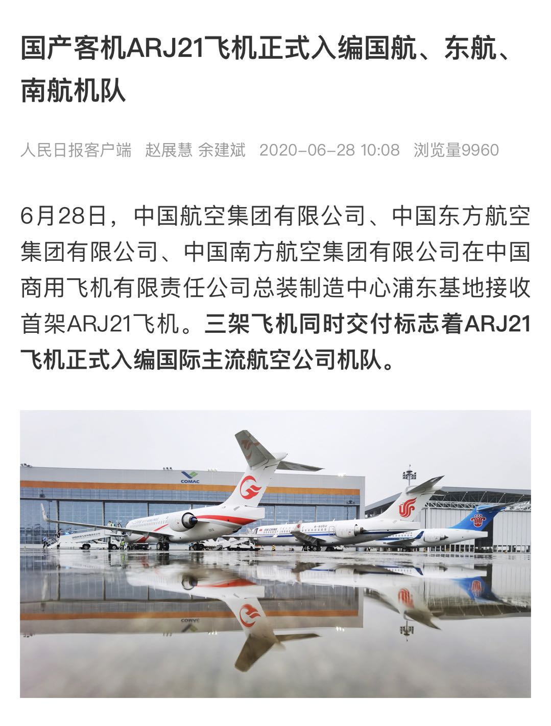 国产客机ARJ21飞机正式入编国航、东航、南航机队。6月28日,中国航空集团有限公司、中国东方航空集团有限公司、中国南方航空集团有限公司在中国商用飞机有限责任公司总装制造中心浦东基地接收首架ARJ21飞机。三架飞机同时交付标志着ARJ21飞机正式入编国际主流航空公司机队。此次交付给国航、东航、南航的三架ARJ21飞机均采用90座全经济舱布局。今年国航、东航、南航将陆续各接收3架ARJ21飞机。