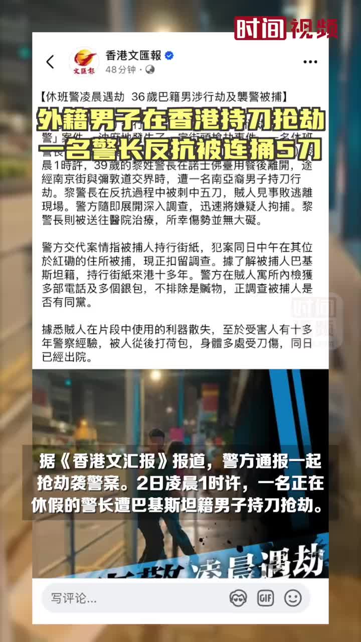 外籍男子在香港持刀抢劫,一名警长反抗被连捅5刀。据《香港文汇报》报道,11月3日,香港警方通报一起抢劫袭警案。2日凌晨1时许,一名正在休假的警长遭巴基斯坦籍男子持刀抢劫。该警长反抗时被刺中五刀,嫌疑人事后逃离现场。随后警方将嫌疑人拘捕。该警长被送医治疗,所幸并无大碍已出院。 (via 时间视频)