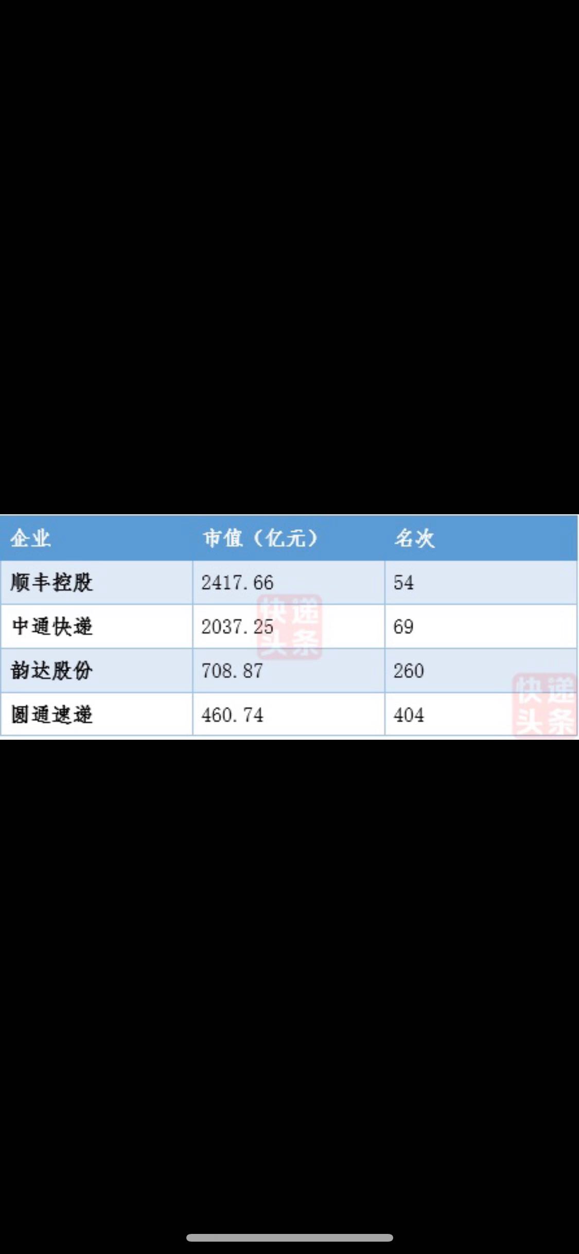 顺丰和中通的市值仅差不到400亿元,两者在中国百强公司的排序也缩小至20名以内