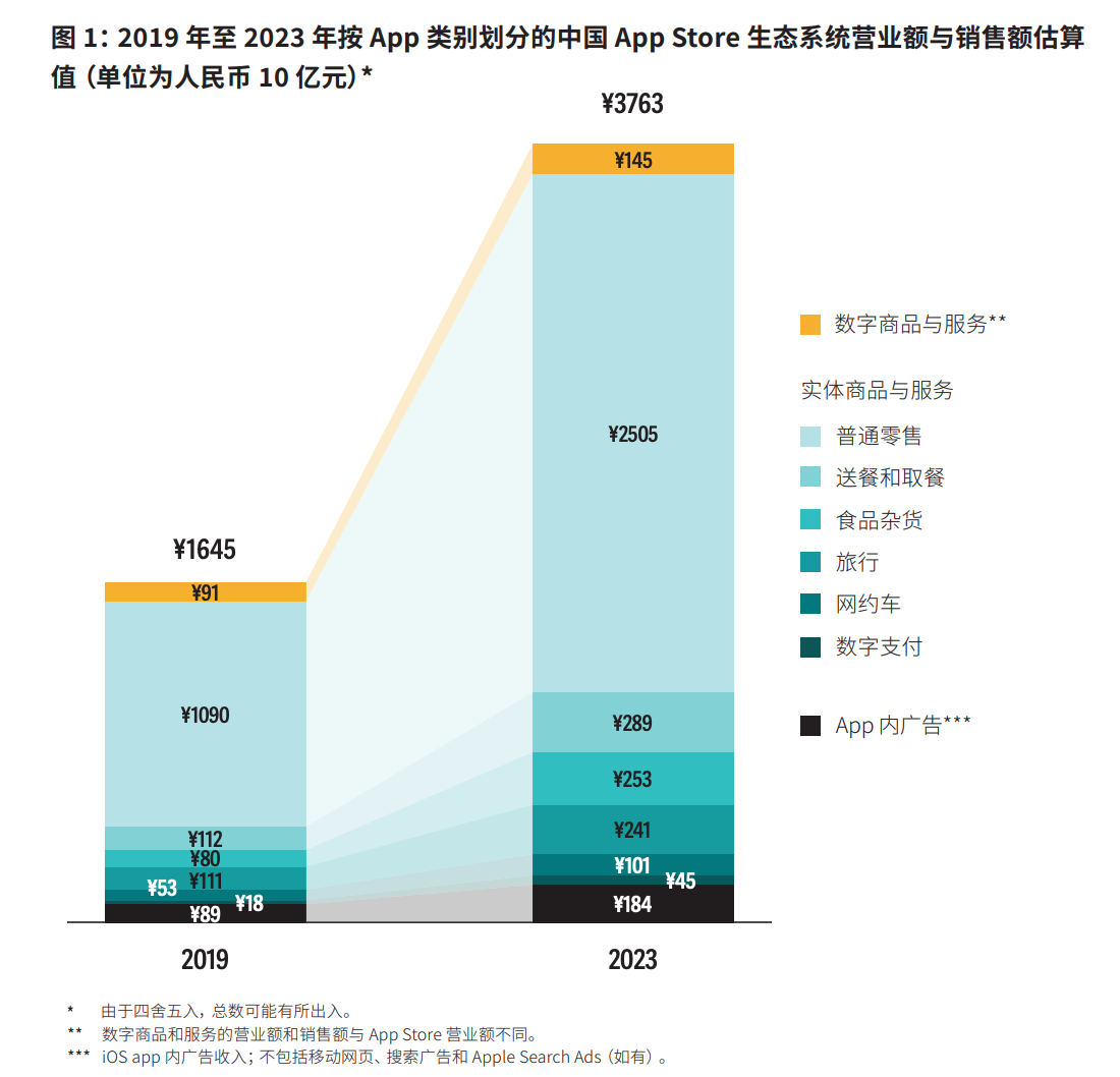 报告写道,从2019年到2023年,Apple App Store生态系统在中国促成的开发者营业额和销售额从1.65 万亿元增长到了3.76万亿元,其中超过 95%完全归各种规模的开发者和企业所有,无需支付苹果任何佣金。