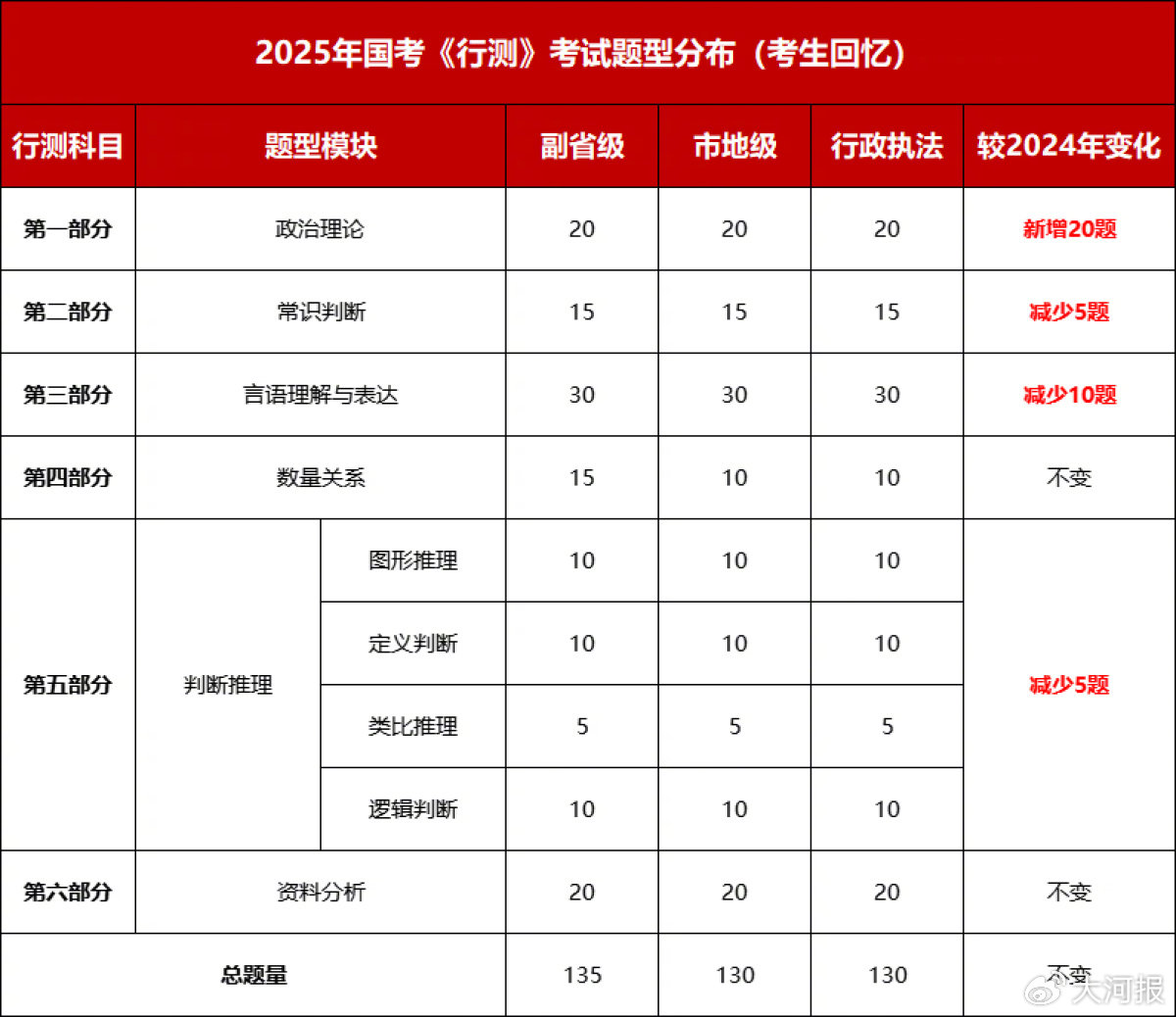 国考行测题量分布变化较大,考生:没想到新增20道政治理论。据大河报,12月1日,2025年度国考公共科目开考,行测考试结束后,考生们大多各自拿着手机与亲友通话,偶有相伴考试的考生在交流上午的考试,大多称行测试卷“根本做不完”。有考生从郑州市某考点出场对大河报记者表示,“最后考试只剩20分钟时间了,还有15道常识题没做”“题根本做不完,最后还有几十道题来不及看,全随机蒙的”“以为是一套卷子,没想到发下来一本书”……
