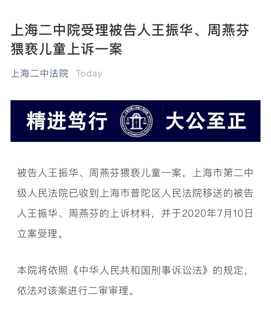 上海二中院受理被告人王振华、周燕芬猥亵儿童上诉一案。被告人王振华、周燕芬猥亵儿童一案,上海市第二中级人民法院已收到上海市普陀区人民法院移送的被告人王振华、周燕芬的上诉材料,并于2020年7月10日立案受理。本院将依照《中华人民共和国刑事诉讼法》的规定,依法对该案进行二审审理。