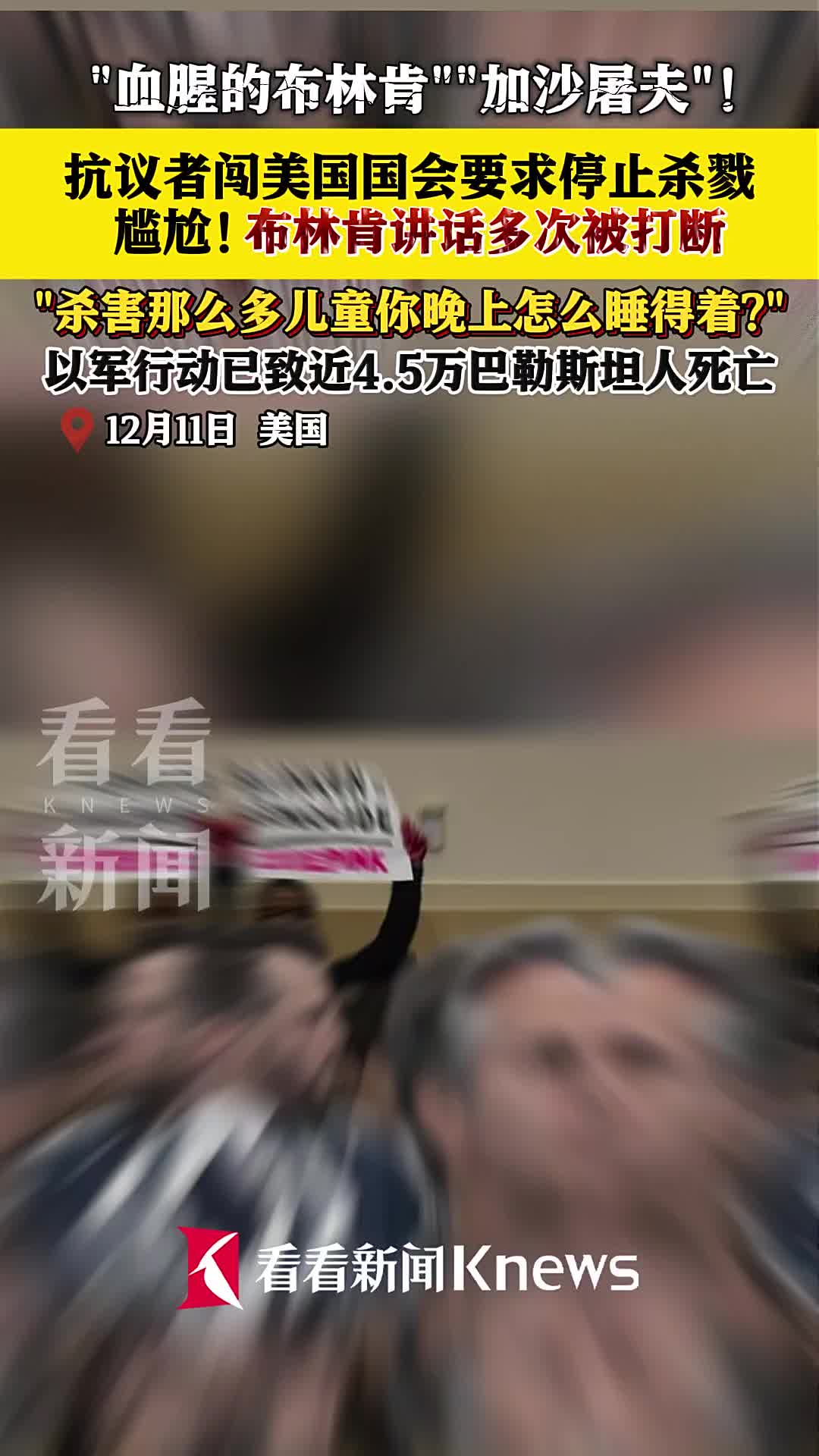 报道称,当布林肯开始讲话时,一名抗议者高喊“血腥的布林肯”和“加沙屠夫”。第二名示威者则举着写有“停止轰炸儿童”的标语,大喊“停止杀害加沙儿童”和“你们在帐篷里杀害这么多儿童,我不知道你们晚上怎么能睡得着”。报道补充说,这名抗议者随后被逮捕并被带离会议厅。尽管讲话被打断,布林肯仍继续作证。但不久后,第三名抗议者闯入再次将布林肯的讲话打断。 (via 看看新闻全球眼)
