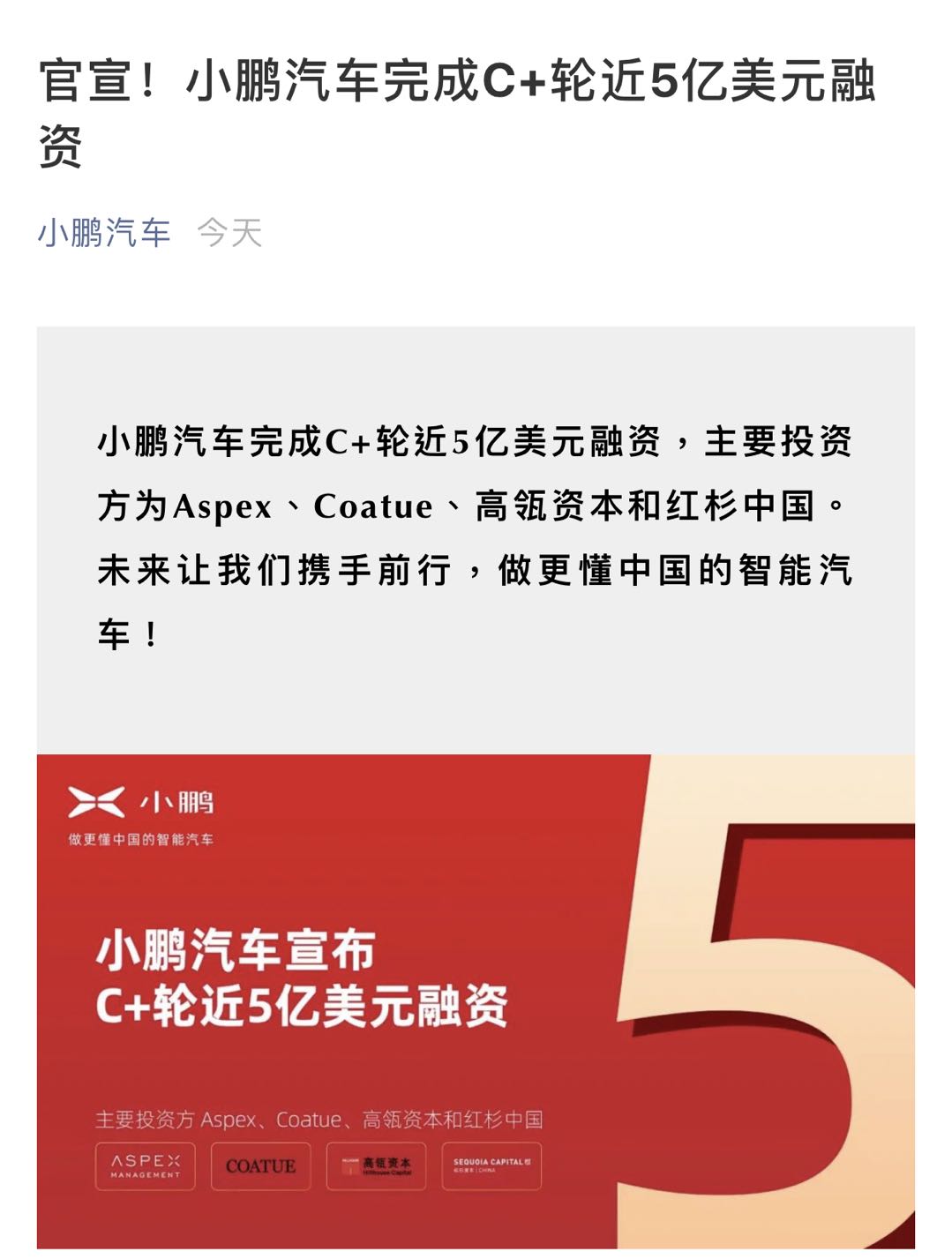 小鹏汽车今天宣布完成签署由Aspex、Coatue、高瓴资本和红杉中国等知名投资机构参与的C+轮融资,融资金额近5亿美元。