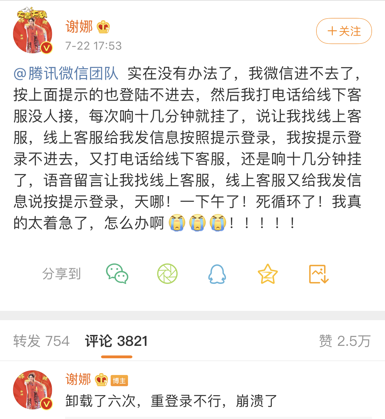 今日主持人谢娜发文表示个人微信出现问题,登录不上去,并表达了对微信官方客服服务的不满。