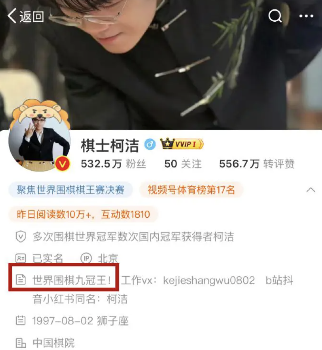 柯洁微博简介改为世界围棋九冠王。