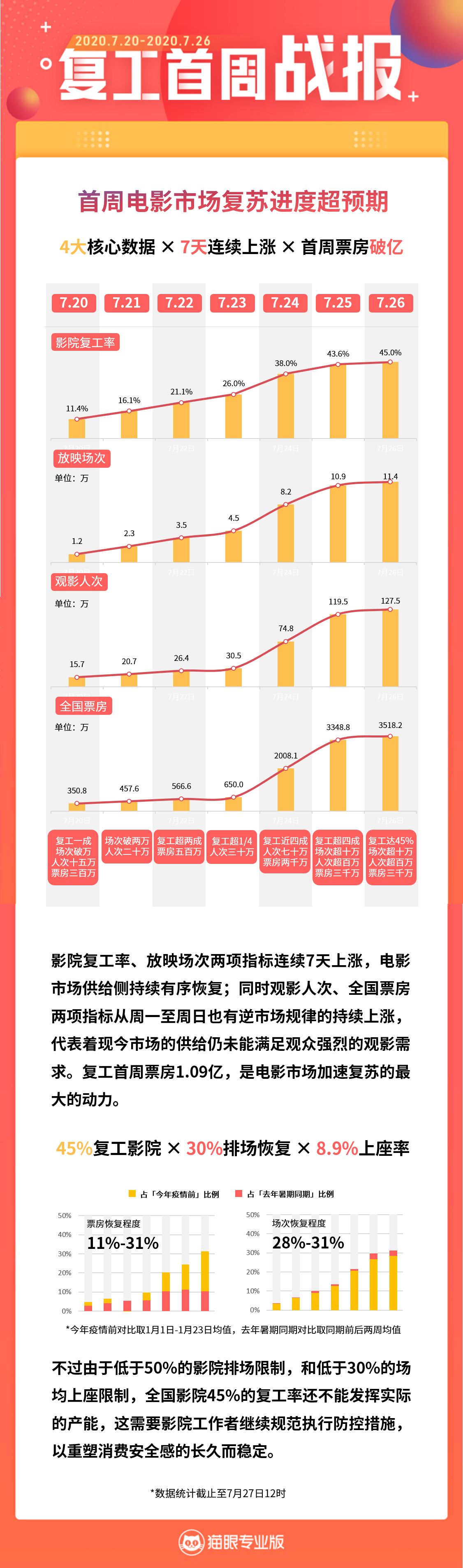影院复工首周:96%票价低于去年均线。7月27日,猫眼发布《复工首周战报》,复盘7月20日至7月26日电影行业复工情况。战报显示,电影复工首周票房达到1.09亿元,其中高口碑新片《多利特的奇幻冒险》成为当周票房冠军,票房达到3567万元。为持续激活票房市场,各地影院提供优惠观影体验,96%影院的票价低于去年平均水平。影院复工率一周恢复至45%,场次数字翻了近10倍;在观众层面,观影人次与票房均在周日达到巅峰,127.5万观众贡献了3518.2万元票房。