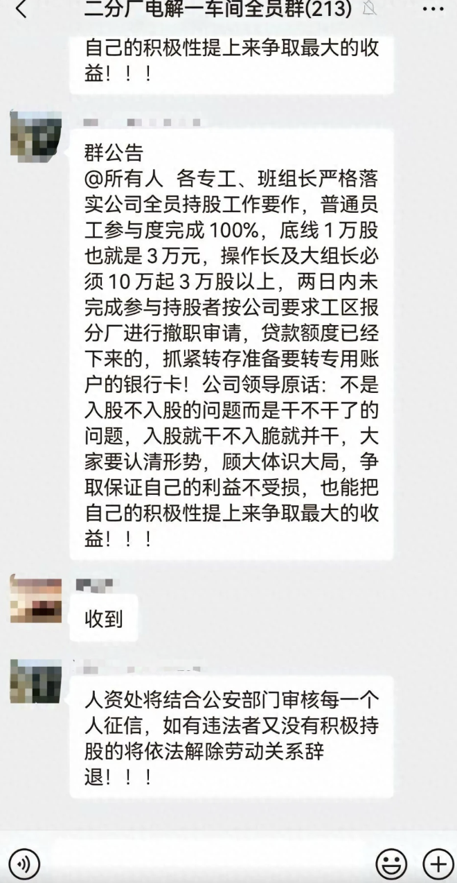网传信息显示,在一个名为“二分厂电解一车间全员群”的微信群内,一名群管理人员发布群公告称,各专工、班组长严格落实公司全员持股工作,普通员工参与度完成100%。