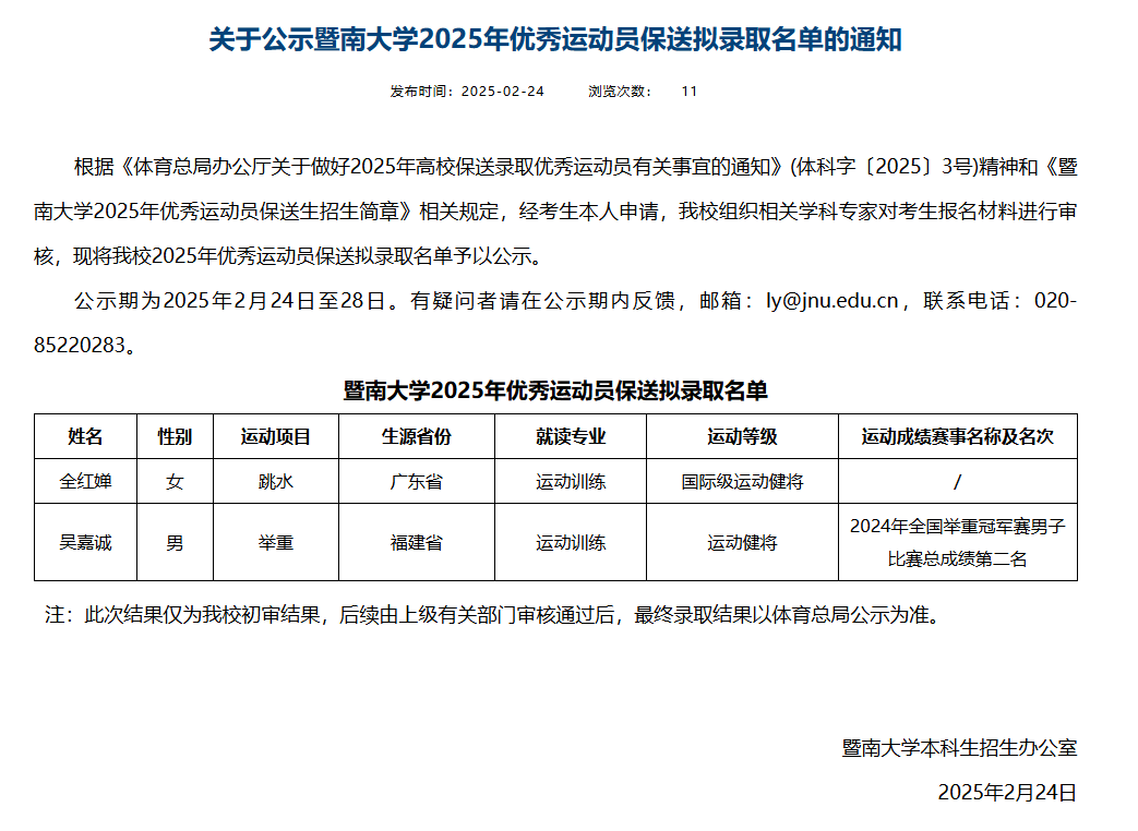 据九派新闻,2月24日,暨南大学本科生招生办公室公布了《关于公示暨南大学2025年优秀运动员保送拟录取名单的通知》。