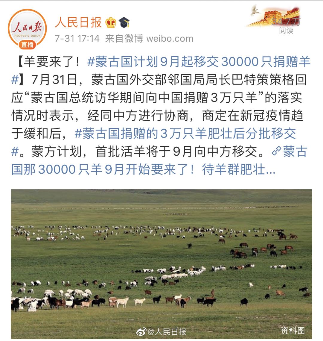 蒙古国计划9月起移交30000只捐赠羊。7月31日,蒙古国外交部邻国局局长巴特策策格回应“蒙古国总统访华期间向中国捐赠3万只羊”的落实情况时表示,经同中方进行协商,商定在新冠疫情趋于缓和后,蒙古国捐赠的3万只羊肥壮后分批移交。蒙方计划,首批活羊将于9月向中方移交。