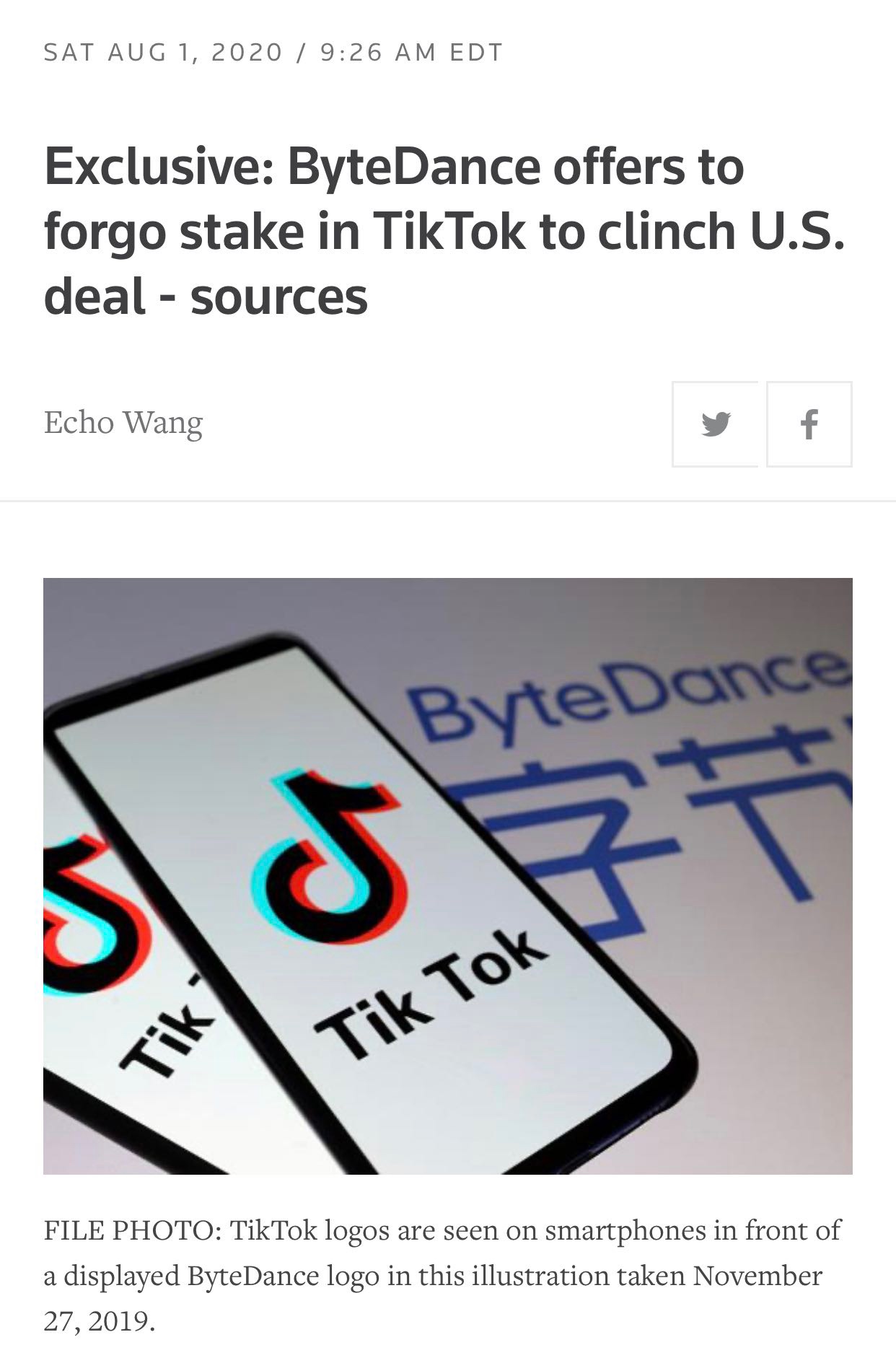 路透独家:字节跳动同意放弃在TikTok的股份,以达成在美国的交易