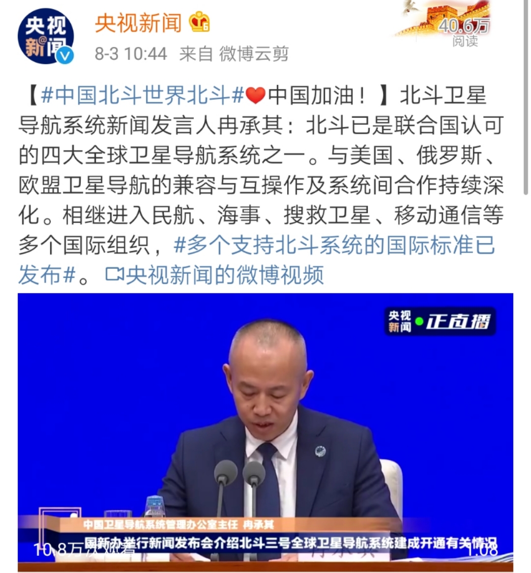 冉承其:北斗已是联合国认可的四大全球卫星导航系统之一。8月3日上午10时,国务院新闻办公室举行新闻发布会,中国卫星导航系统管理办公室主任、北斗卫星导航系统新闻发言人冉承其介绍:北斗已是联合国认可的四大全球卫星导航系统之一。与美国、俄罗斯、欧盟卫星导航的兼容与互操作及系统间合作持续深化。相继进入民航、海事、搜救卫星、移动通信等多个国际组织,多个支持北斗系统的国际标准已发布。