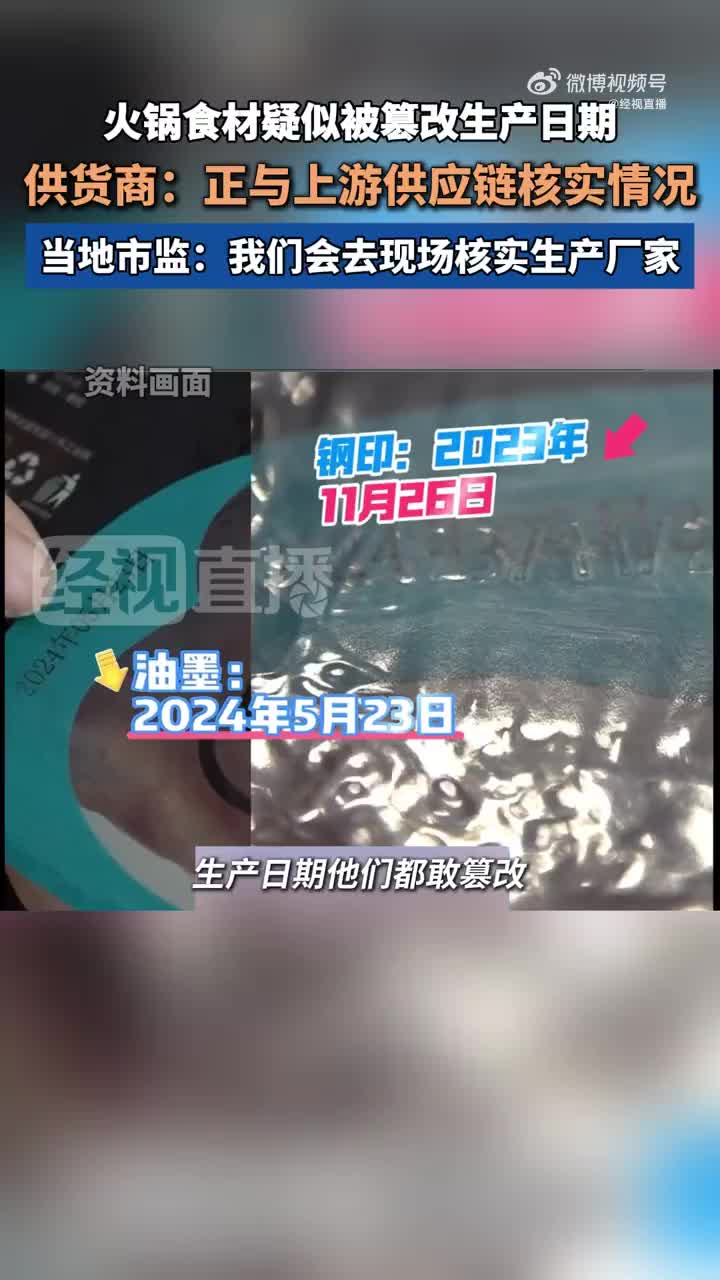 据经视直播,近日,河南郑州,火锅食材疑被篡改生产日期一事引发热议。视频显示,一盒大刀猪腰片竟有两个生产日期,表面标注为2024年5月23日。在灯光下,下方隐约可见钢印标注的2023年11月26日。若依据较早日期计算,该食材已过保质期。据悉,此批 “大刀猪腰片” 由山西太原查特熊公司供货。对此,山西太原查特熊公司回应,可以退回21盒问题产品,并作退款处理。山西查特熊供应链管理有限公司相关负责人称,公司并非生产厂家,货物也非公司直接发出,会向厂家核实情况。