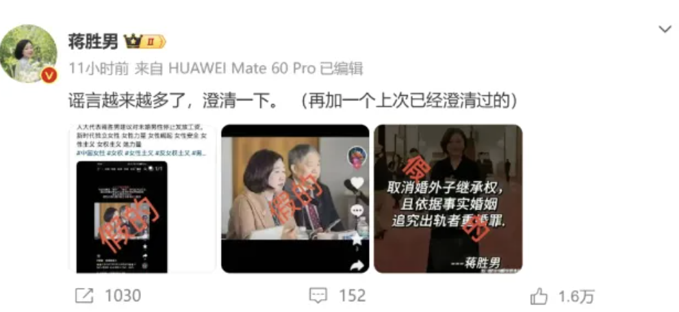 建议对未婚男性停发工资?蒋胜男辟谣。据大皖新闻、潇湘晨报,近日,社交平台一些假冒蒋胜男言论的短视频广泛流传。3月17日晚,蒋胜男发文辟谣“人大代表蒋胜男建议对未婚男性停止发放工资”“取消婚外子继承权,且依据事实婚姻追究出轨者重罪”相关言论,并表示“谣言越来越多了,澄清一下。”蒋胜男,女,汉族,出生于1973年11月,浙江温州人,毕业于北京大学汉语言文学专业,2016年,加入中国作家协会。第十三届全国人大代表,第十四届全国政协委员。
