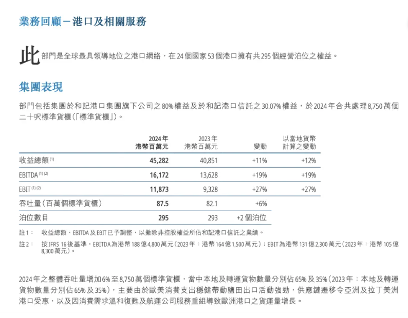 从长和旗下主要业务板块来看,港口及相关服务2024年录得收入约452.82亿港元,同比增长11%,主要是由于吞吐量上升6%以及所有分部有所增长带动,其中仓储收入增长13%。