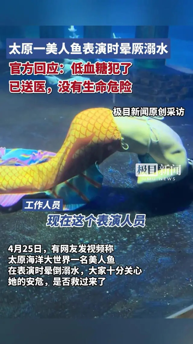 家属称溺水“美人鱼”仍在重症监护室,涉事海洋大世界暂停营业。据新快报综合,4月25日,山西太原海洋大世界一名“美人鱼”在表演时晕厥溺水,后被工作人员救起,相关视频在网上传播后,引发网友担忧。当地官方表示已送医,没有生命危险。4月26日,记者从该“美人鱼”表演者的家属处获悉,目前“美人鱼”意识清醒,有胸闷症状,但仍在重症监护室,需做进一步观察。目前,涉事的太原海洋大世界已暂停营业,其官方抖音账号已删除了25日晚“美人鱼”醒后发声的视频。