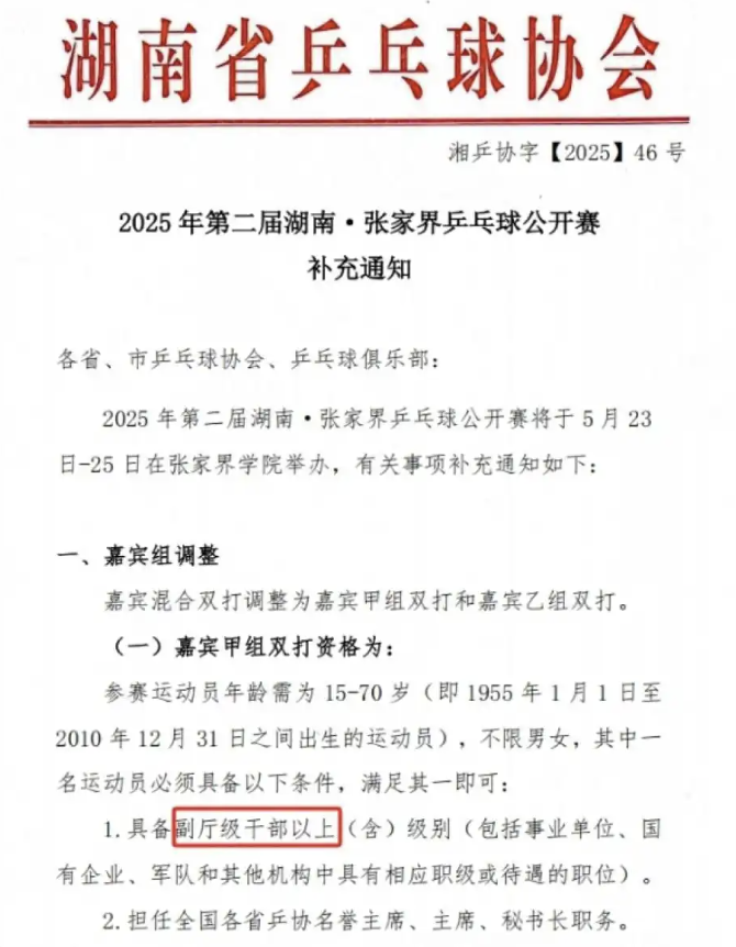据大河报,4月26日,一份关于“2025 年第二届湖南张家界乒乓球公开赛补充报名”需副厅级、副处级资格的通知引发网友关注。文件显示,赛事包含嘉宾甲组和乙组双打,报名资格要求,嘉宾甲组:其中一名运动员需为副厅级及以上干部(含事业单位、国企、军队对应职级),或担任各省乒协名誉主席、主席、秘书长,或为组委会特邀嘉宾。
