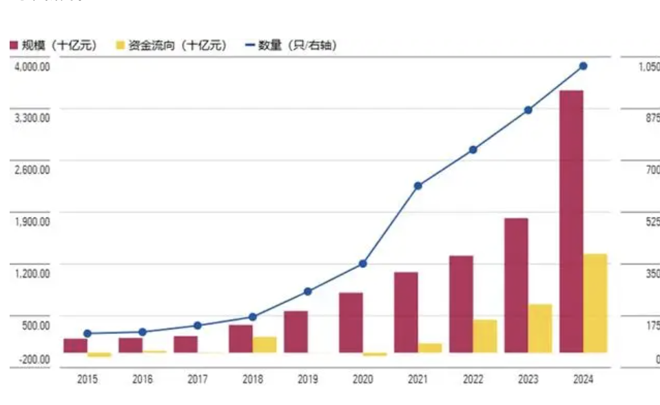 ETF规模突破第一个万亿元历时16年之久,而从三万亿到四万亿元仅耗时半年多。规模迅猛增长背后,ETF已成为包括国家队在内的各路资金借道入市的重要工具,被视为类“平准基金”的主要载体。