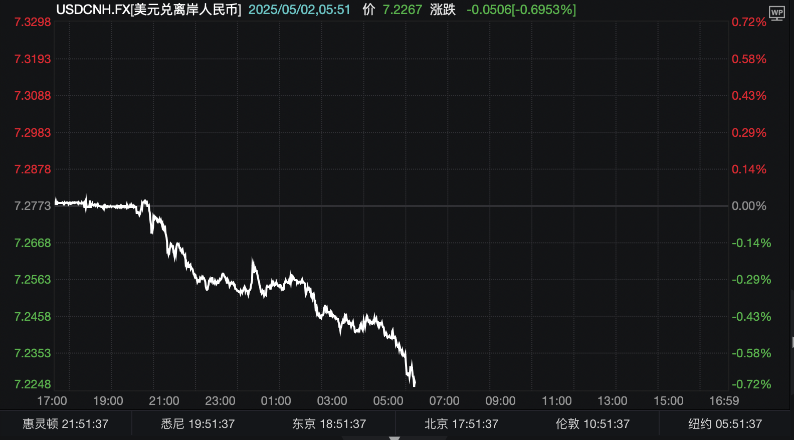 5月2日,离岸人民币兑美元日内涨逾500点,现报7.2267。