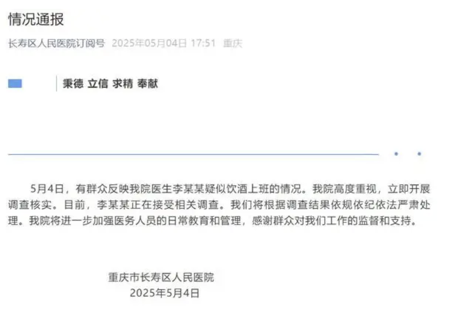 重庆市长寿区人民医院通报“医生李某某疑似饮酒上班”:开展调查核实。重庆市长寿区人民医院通报:5月4日,有群众反映我院医生李某某疑似饮酒上班的情况。我院高度重视,立即开展调查核实。目前,李某某正在接受相关调查。我们将根据调查结果依规依纪依法严肃处理。我院将进一步加强医务人员的日常教育和管理,感谢群众对我们工作的监督和支持。