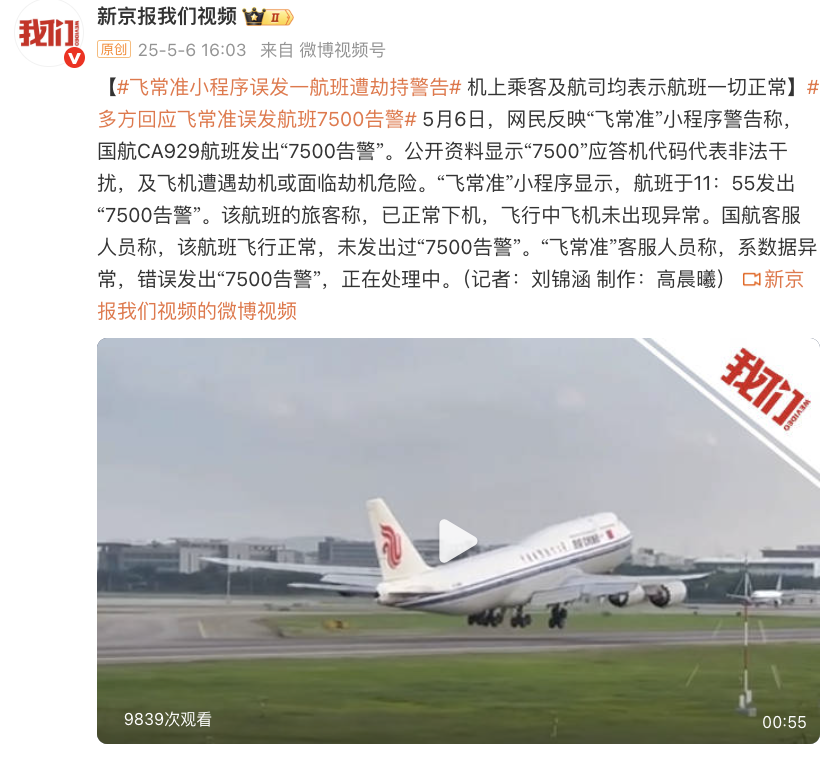 飞常准小程序误发一航班遭劫持警告,机上乘客及航司均表示航班一切正常。据新京报,5月6日,网民反映“飞常准”小程序警告称,国航CA929航班发出“7500告警”。公开资料显示“7500”应答机代码代表非法干扰,及飞机遭遇劫机或面临劫机危险。“飞常准”小程序显示,航班于11:55发出“7500告警”。该航班的旅客称,已正常下机,飞行中飞机未出现异常。国航客服人员称,该航班飞行正常,未发出过“7500告警”。“飞常准”客服人员称,系数据异常,错误发出“7500告警”,正在处理中。