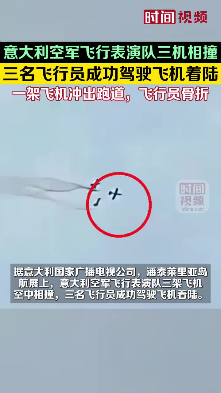 意大利空军飞行表演队三机相撞,三名飞行员成功驾驶飞机着陆。当地时间5月6日,意大利西西里大区。据意大利国家广播电视公司,潘泰莱里亚岛航展上,意大利空军飞行表演队三架飞机空中相撞,三名飞行员成功驾驶飞机着陆。两架飞机尾部受到严重损坏。第三架飞机在降落时冲出跑道,一名飞行员腿部骨折被送医。目前意空军正在调查。 (via 时间视频)