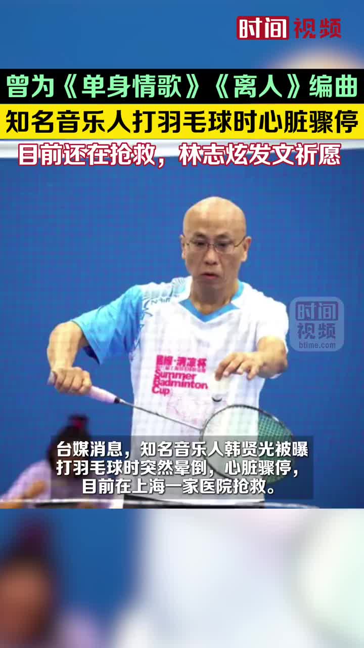 知名音乐人打羽毛球时心脏骤停仍在抢救,林志炫发文祈愿。5月7日,知名音乐人韩贤光被曝打羽毛球时突然晕倒,心脏骤停,目前在上海一家医院抢救。8日,歌手林志炫发文祈愿,希望韩贤光早日康复。据悉,林志炫的金曲《单身情歌》《离人》由韩贤光编曲。据悉,韩贤光是印尼华侨,1978年来到中国台湾踏入乐坛,曾担任过演唱会总监、金曲奖评审等要职。(via 时间视频)