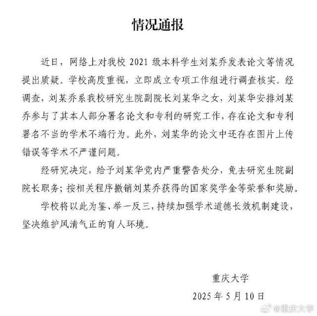 重庆大学5月10日发布情况通报称,近日,网络上对该校2021级本科学生刘某乔发表论文等情况提出质疑。学校高度重视,立即成立专项工作组进行调查核实。经调查,刘某乔系该校研究生院副院长刘某华之女,刘某华安排刘某乔参与了其本人部分署名论文和专利的研究工作,存在论文和专利署名不当的学术不端行为。此外,刘某华的论文中还存在图片上传错误等学术不严谨问题。
