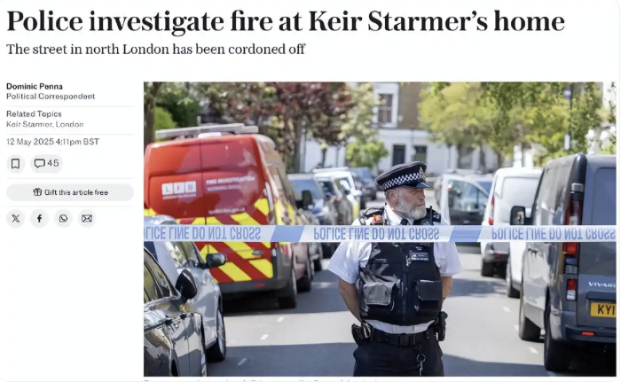 英媒:斯塔默住所起火。据环球网援引英国《每日电讯报》12日报道,当地时间5月12日凌晨,英国首相斯塔默位于伦敦北部的住所起火,目前无人伤亡。英国警方12日正在调查此事。报道称,这是一处四居室住宅,价值约200万英镑。