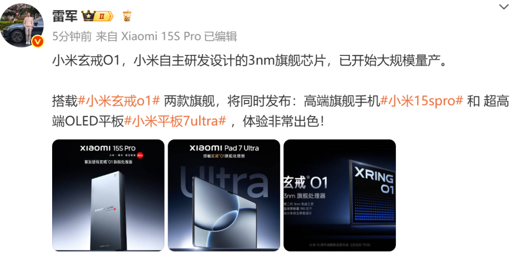 据每经,5月20日上午,小米集团董事长兼CEO雷军在其微博宣布:“小米玄戒O1,小米自主研发设计的3nm旗舰芯片,已开始大规模量产。”